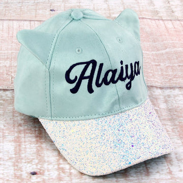Add some style with this fashionable girl's cap. This cap features glitter on the bill and a smooth velvet finish with Velcro adjustable strap and critter ears. Personalize the front of this cap with any text you choose to make it a fun and unique gift for any girl ages 5 and up.