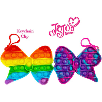 JOJO FIDGET POPPERS PACK - Each set includes two Pop It keychains in the shape of JoJo Siwa's bows: rainbow and purple ombre. Each measures 5.2 x 1 x 4 inches.