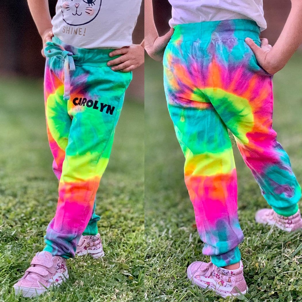 A pair of fleece joggers featuring an abstract neon tie-dye design, fleece backing, elasticized drawstring waistband, and ribbed ankle cuffs. Personalize this item with a custom text with 2 layout options and many fonts to choose from.